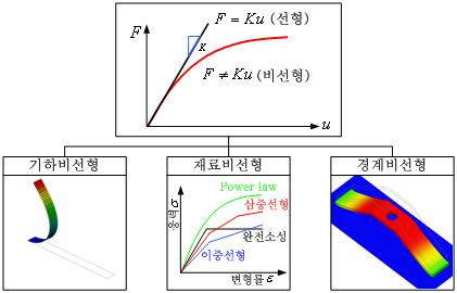 공학문제에 있어 비선형성은 크게 재료비선형(material nonlinear), 기하비선형(geometry nonlinear), 그리고 경계비선형(boundary nonlinear)으로 대별된다. 재료비선형은 탄성계수, 열전달률, 점성거동(viscosity) 등과 같은 재료 고유의 물성값이 일정하지 않고 변형, 온도, 속도 등과 같이 구하고자 하는 거동과 더불어 변하는 경우이다. 기하비선형은 대상 물체의 형상과 크기가 구하고자 하는 변수와 더불어 변하는 경우이다. 마지막으로 경계비선형은 물체 경계영역의 크기, 형상 그리고 경계조건(boundary condition)이 구하고자 하는 변수와 더불어 변하는 경우이다.