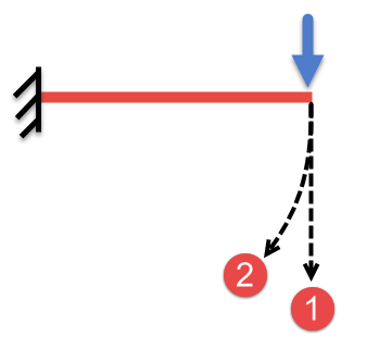 → 기하 비선형은 하중을 받았을 때 변형이 치수에 비해 매우 커질 때 발생합니다. 어렸을 때 자주 먹던 마이쮸를 예로 들겠습니다. 마이쮸를 잡아서 늘리면 쭉 늘어나는 것을 본 적이 있을겁니다. 그 마이쮸의 모양이 변하게 되면 마이쮸가 가지고 있던 고유의 강성이 변하게 됩니다. 마이쮸가 쭉 늘어나서 10cm가 늘어났다?! 와 이거 크게 변했네! 해서 대.변.형....ㅋㅋ 기하급수적으로 크게 변하는 것을 기하 비선형이라고 합니다. 대표적으로 대변형, 대변위, 대회전, 좌굴 등이 있습니다. 전산역학에서 트러스 해석을 하는데 얇고 긴 막대를 이용하여 계산하는 거라 좌굴해석을 이용했던 것이 생각나네요. 얇고 긴 막대를 휘었을 때 많이 휘어질 거라 예상된다면 기하비선형을 계산해보심 될 것입니다.