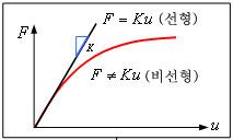 → 자연계의 모든 현상은 비선형적 거동을 나타냅니다. 나무젓가락을 부러뜨렸을 때조차도 비선형적 거동이라고 하죠. 위의 그래프에 있는 식 F=Ku 식은 유한요소 해석의 구조강성행렬이 생각납니다. 선형 해석은 행렬 방정식에서 강성행렬(stiffness matrix) [K]가 물체의 거동 {u}와 무관한 일정한 값을 가진다고 말했었죠. 그래서 u값을 구하려면 강성행렬을 역행렬로 취해 쉽게 구할 수 있습니다. 하지만 비선형 해석을 여러 가지 조건(계수)이 섞이고 얽혀 많은 계산을 수행해야 합니다. 선형이란 말 그대로 직선으로 이루어져 있는 값입니다. 그래서 어떠한 값을 변할 때 값 또한 비례적으로 증감하는 것을 알 수 있습니다. 하지만 비선형이라는 것은 선형적이지 않다는 것(non)이기 때문에 한눈에 예측하기 어렵습니다. F=Ku를 행렬로 생각한다면, 선형 해석은 K가 독립적이어서 u값을 쉽게 구할 수 있지만 비선형 해석은 K와 u가 연결되어있는, 독립적이지 않으며 같은 미지수를 가지고 있다고 생각하시면 될 것 같습니다. K 안에 미지수 x, u안에 미지수 x.